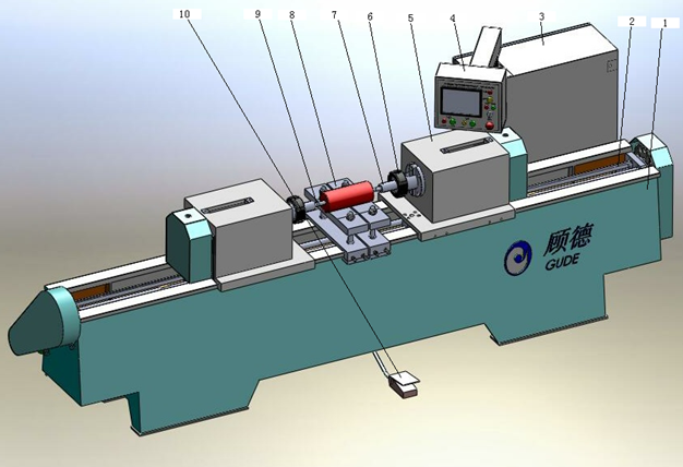 設備由床身、傳動總成、左右機箱、壓裝機具、輥皮支臺、電控箱、觸摸屏操控站、專用程序及附件組成,附加軸定位機構。(若托輥軸端有頂尖眼,此機構不需配置)